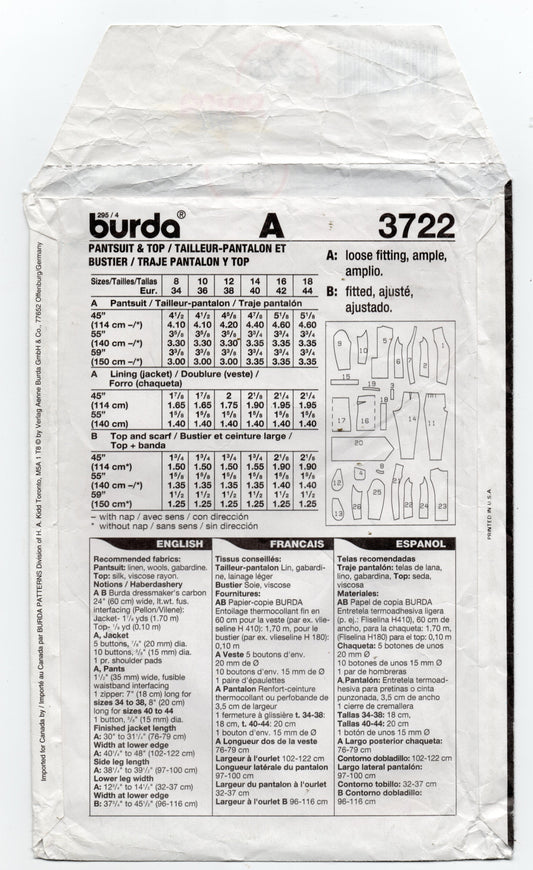 Burda Couture 3722 Womens Longline Jacket Pants Top & Sash Out Of Print Sewing Pattern Sizes 8 - 18 UNCUT Factory Folded