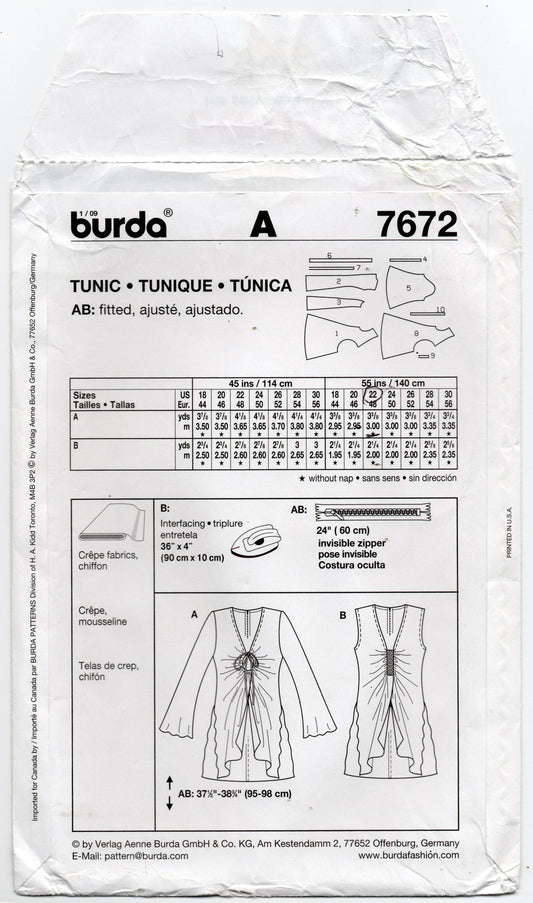 Burda 7672 Womens Tie Front Summer Tunic 1990s Vintage Sewing Pattern Sizes 18 - 30 UNCUT Factory Folded