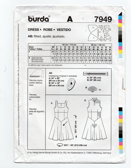 Burda 7949 Womens Sleeveless Fit & Flared Dress Out Of Print Sewing Pattern Sizes 6 - 18 UNCUT Factory Folded