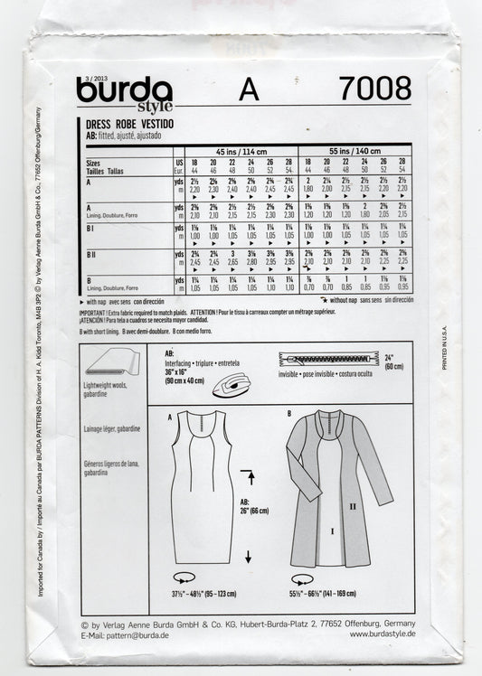 Burda 7008 Panelled Dress or Pinafore Out Of Print Sewing Pattern Sizes 18 - 28 UNCUT Factory Folded