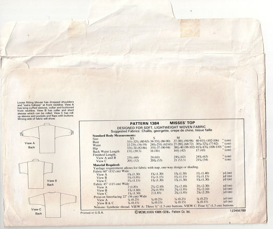 Kwik Sew 1384 Womens Pullover Top with Draped Neck & Pockets 1980s Vintage Sewing Pattern Size XS - L UNCUT Factory Folded