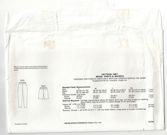 Kwik Sew 1887 Retro Mens Elastic Waist Casual Shorts & Pants with Pockets 1980s Vintage Sewing Pattern Size S-XL UNCUT Factory Folded