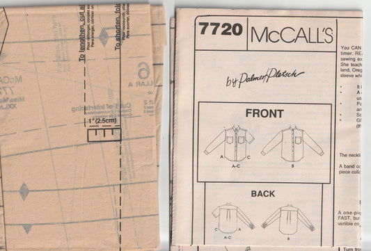 McCall's 7720 PALMER PLETSCH Mens Womens UNISEX 2 Hour Classic Button Front Shirts 1990s Vintage Paper Sewing Pattern Sizes XL & XXL UNCUT Factory Folded