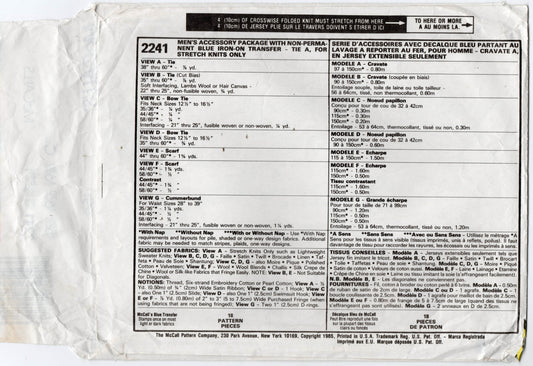McCall's 2241 Mens Accessory Pack Ties Bow Tie Scarf & Cummerbund Monogram Transfer 1980s Vintage Sewing Pattern UNCUT Factory Folded