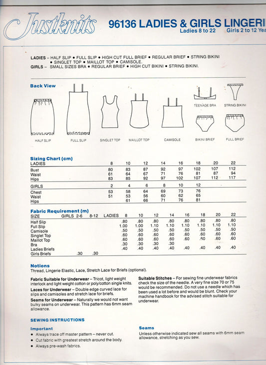 Justknits 96136 Womens & Girls Lingerie Slips Panties Camisoles etc 1980s Vintage Sewing Pattern Sizes 8 - 22 and Girls 2 - 12 Years UNCUT Factory Folded
