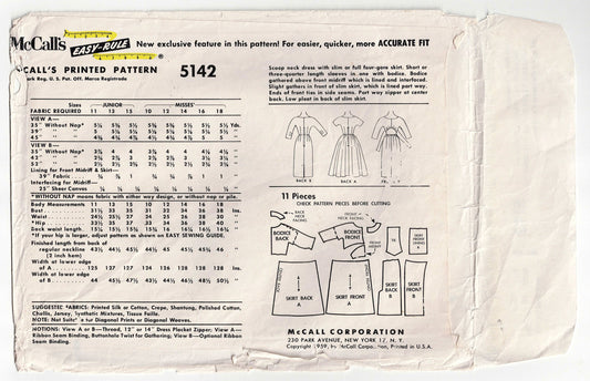 McCall's 5142 Womens Dress with Shaped Gathered Bodice & Sheath or Flared Skirt 1950s Vintage Sewing Pattern Size 16 Bust 36 inches