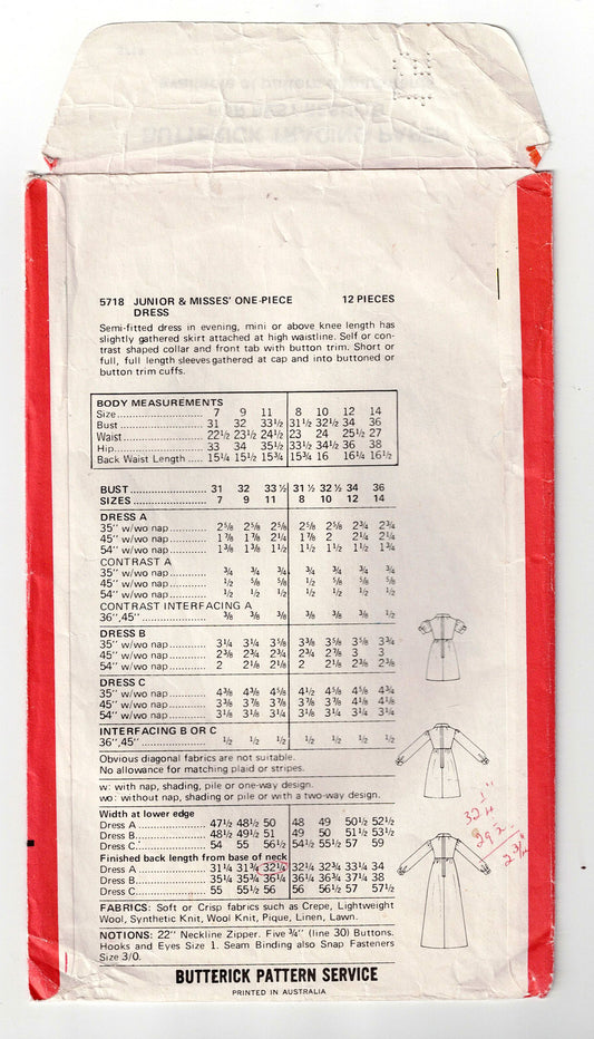 Butterick 5718 Junior Womens High Waisted Dress with Peter Pan Collar 1970s Vintage Sewing Pattern Size 11 Bust 32 inches