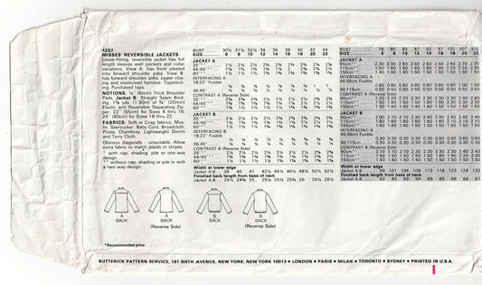 Butterick 4297 Womens Reversible Jackets 1980s Vintage Sewing Pattern Size 18 - 22 UNCUT Factory Folded