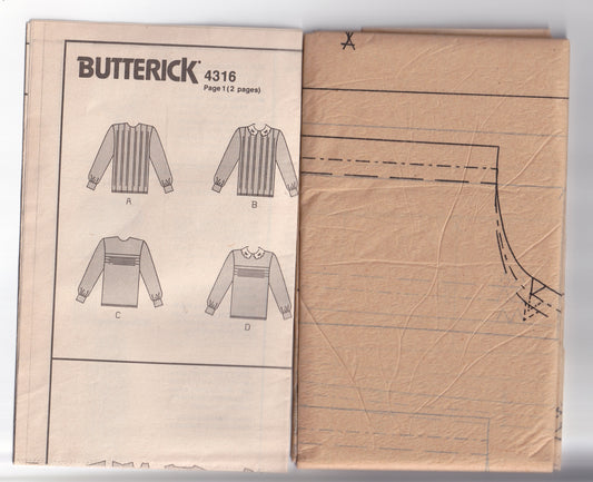 Butterick 4316 Womens Back Buttoned Pleated Blouses 1980s Vintage Paper Sewing Pattern Size 8 - 12 UNCUT Factory Folded