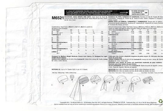 McCall's 6521 Womens EASY Stretch Headband Wrap & Hats Out Of Print Sewing Pattern Size XS - L UNCUT Factory Folded