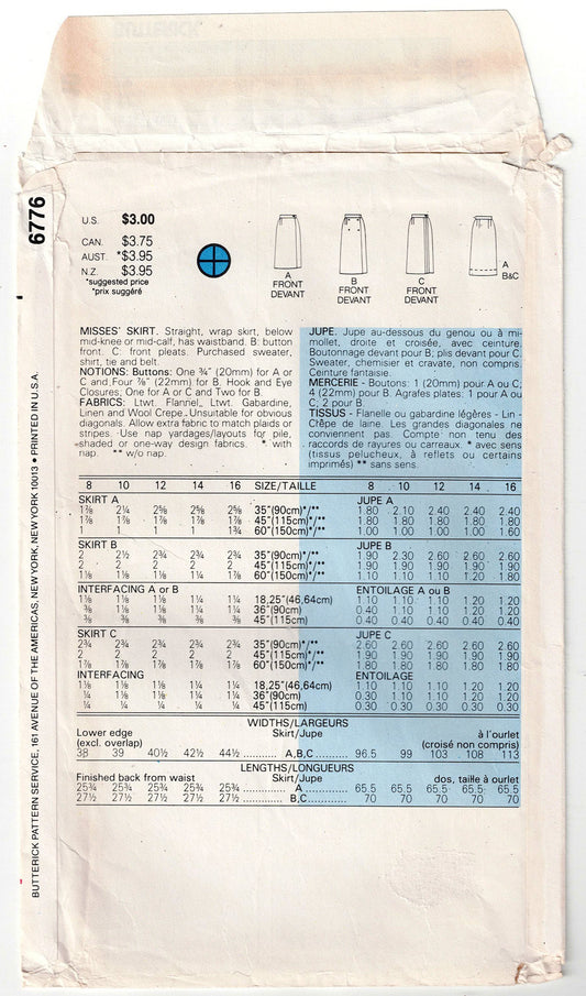 Butterick 6776 Womens EASY Wrap Skirts 1980s Vintage Sewing Pattern Size 10 Waist 25 Inches UNCUT Factory Folded