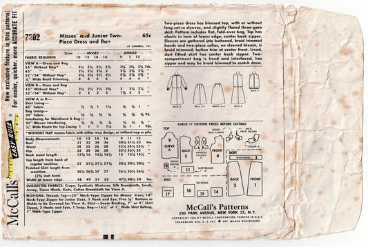 McCall's 7202 Womens Blouse Skirt & Purse 1960s Vintage Sewing Pattern Size 16 Bust 36 inches