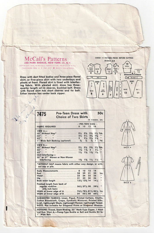 McCall's 7475 Teen Girls Dress with Pleated or Plain Skirt 1960s Vintage Sewing Pattern Size 14 Bust 33 inches