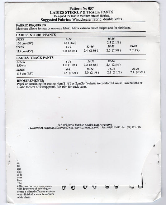 J & L Stretch 057 Womens Leggings & Stirrup Pants Trackpants 1980s Vintage Sewing Pattern Size 6 - 26 UNCUT Factory Folded