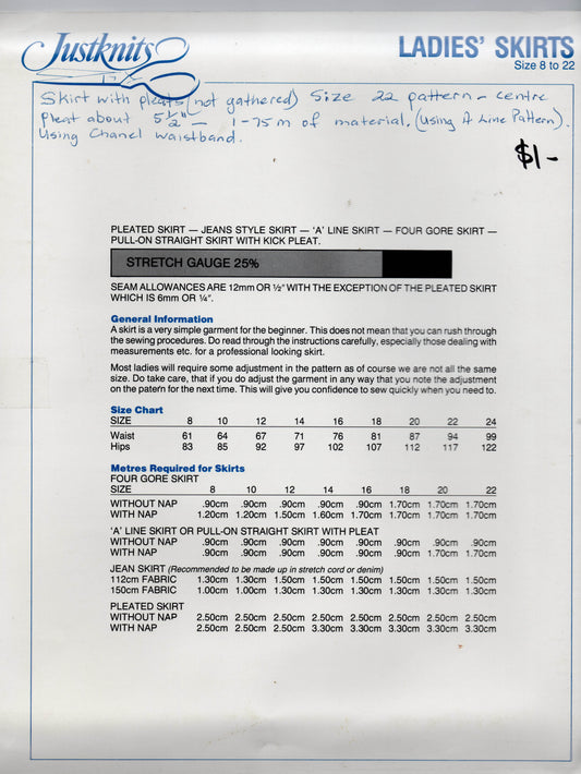 Justknits Womens Stretch Skirts in 5 Styles 1980s Vintage Sewing Pattern Sizes 8 - 22 UNCUT Factory Folded
