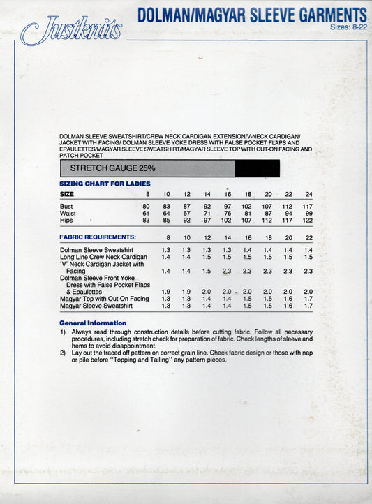 Justknits 9615 Womens Stretch Dolman/Magyar Sleeved Dress Top & Jacket 1980s Vintage Master Sewing Pattern Sizes 8 - 22 UNCUT Factory Folded