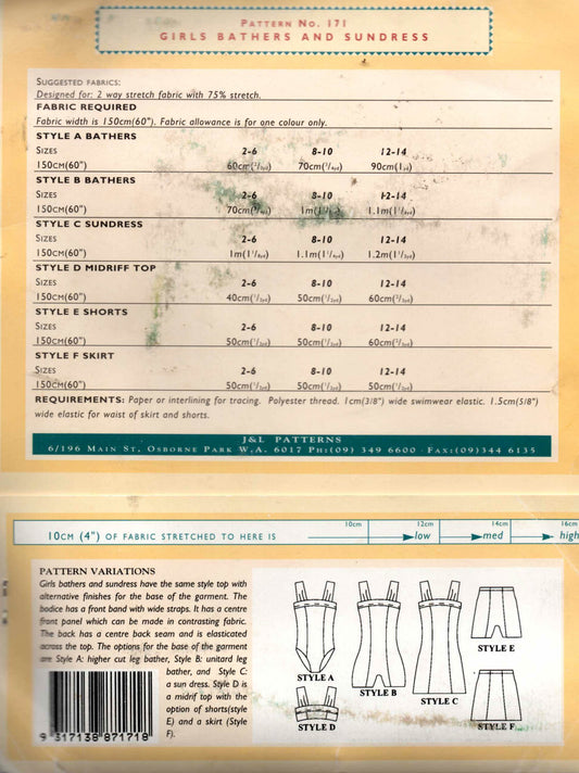 J & L 171 Girls Swimsuit Bikini Swim Dress Skirt & Midriff Top 1990s Sewing Pattern Sizes 2 - 14 UNCUT Master Pattern