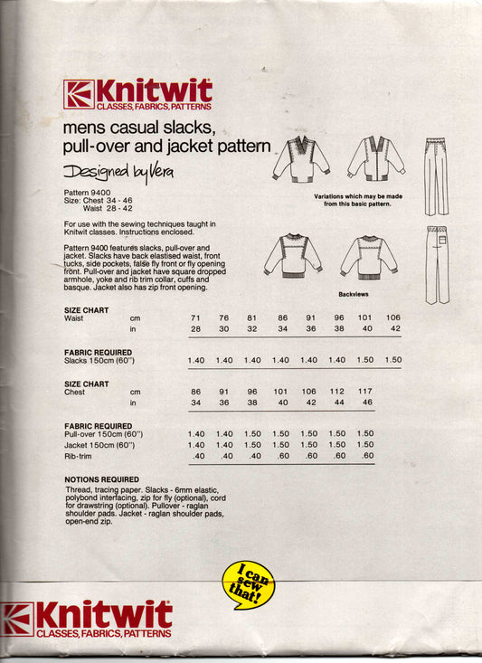 Knitwit 9400 Mens Casual Pants Pullover Top & Zip Front Jacket 1980s Vintage Sewing Pattern Size 34 - 46 UNCUT Factory Folded