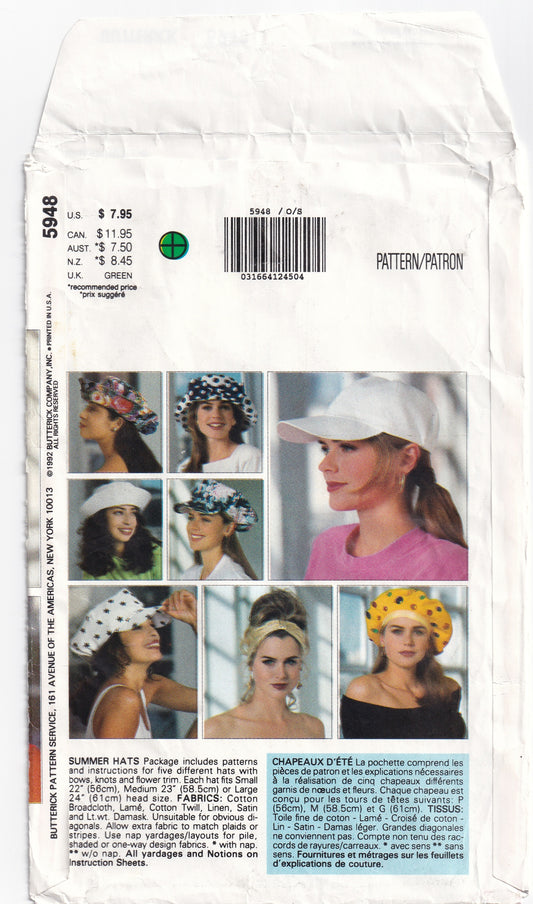 Butterick 5948 Womens Summer Hats in 13 Styles 1990s Vintage Sewing Pattern UNCUT Factory Folded