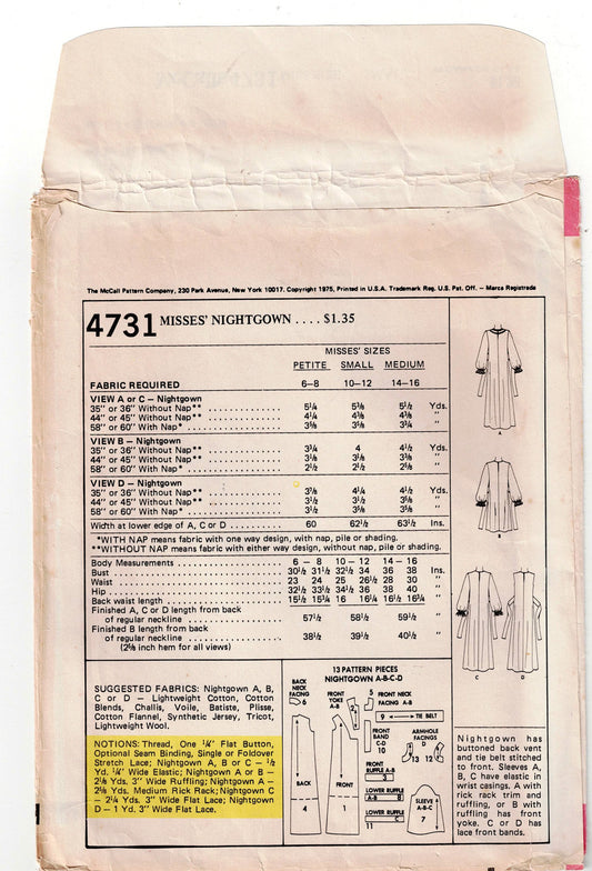 McCall's 4731 Womens Ruffled Nightgown 1970s Vintage Sewing Pattern Size SMALL UNCUT Factory Folded