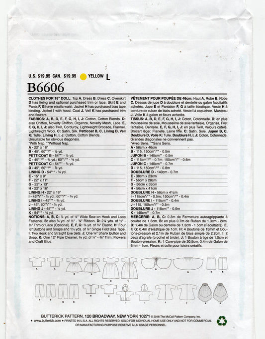 Butterick B6606 Retro 1960 Dolls Clothes Wardrobe Sewing Pattern for 18 Inch Dolls UNCUT Factory Folded