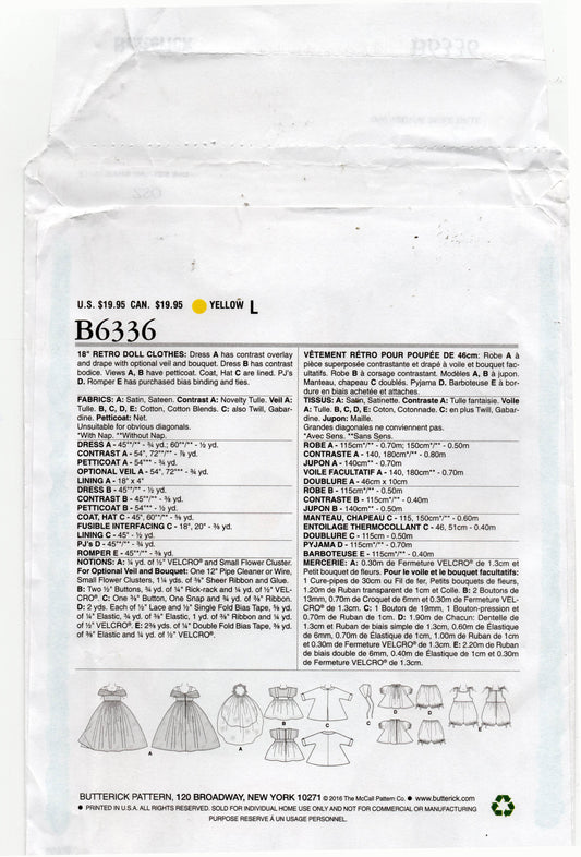 Butterick 6336 Retro 1957 Dolls Clothes Wardrobe Sewing Pattern for 18 Inch Dolls UNCUT Factory Folded