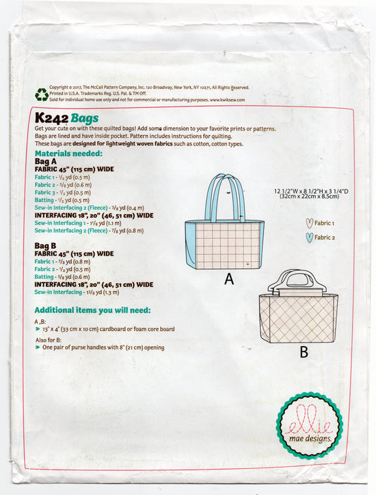Kwik Sew K242 Ellie Mae Designs Quilted Carryall Bags Out Of Print Sewing Pattern UNCUT Factory Folded