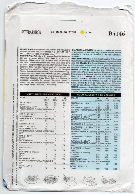 Butterick B4146 Womens Decorated Hats Out Of Print Sewing Pattern UNCUT Factory Folded