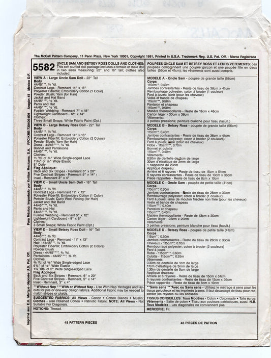 McCall's 5582 Decorative Uncle Sam & Betsey Ross Dolls & Clothes 1990s Vintage Sewing Pattern UNCUT Factory Folded