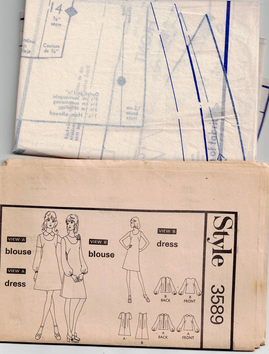 Style 3589 Womens Dress or Pinafore & Blouse 1970s Vintage Paper Sewing Pattern Size 16 Bust 38 inches