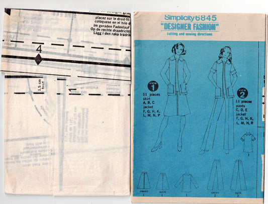 Simplicity 6845 DESIGNER Womens Wide Collar Jacket Skirt & Flared Leg Pants 1970s Vintage Paper Sewing Pattern Size 12 Bust 34 inches