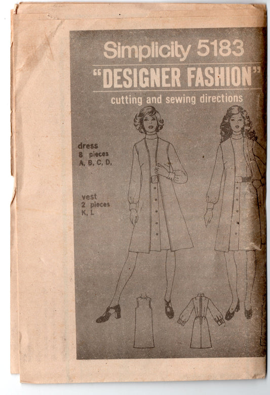Simplicity 5183 Designer Womens Dress & Vest 1970s Vintage Paper Sewing Pattern Size 14 or 16 UNCUT Factory Folded NO ENVELOPE