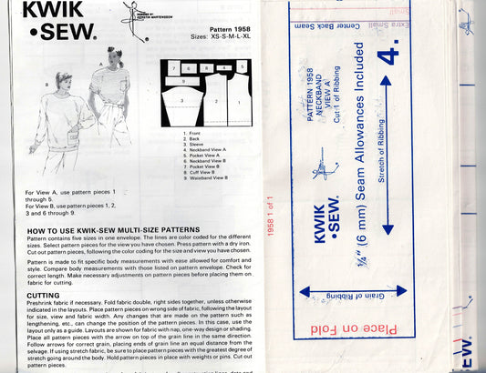 Kwik Sew 1958 Womens Stretch Knit T Shirt & Sweatshirt 1980s Vintage Sewing Pattern Size XS - L UNCUT Factory Folded