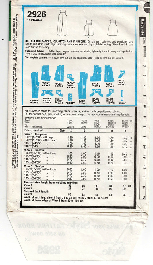 Style 2926 Girls/Boys Pinafore Dress Rompers & Dungarees 1980s Vintage Sewing Pattern Size 3 UNCUT Factory Folded