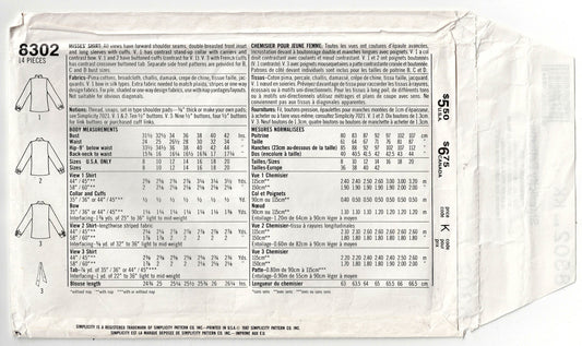 Simplicity 8302 Womens Double Breasted Shirts 1980s Vintage Sewing Pattern Size 8 - 14 UNCUT Factory Folded