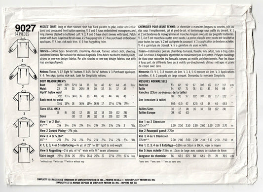 Simplicity 9027 Womens Shirts with Optional Monogram Trim 1980s Vintage Sewing Pattern Sizes 16 - 20 UNCUT Factory Folded