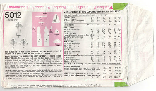 Simplicity 5012 Womens Square Neck Tucked Bodice Maxi Dress 1970s Vintage Sewing Pattern Size 12 Bust 34 inches
