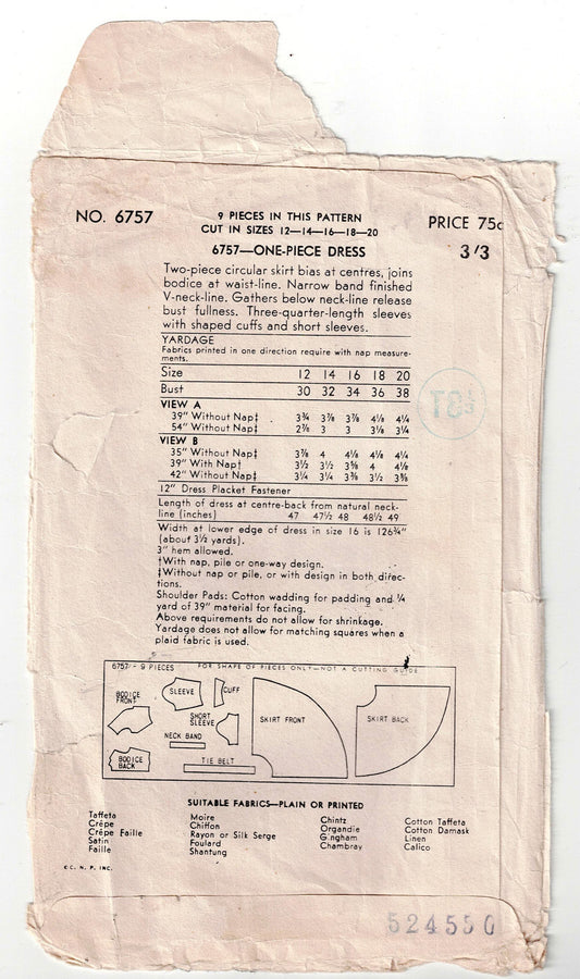 Vogue 6757 Womens Dress with Sheer Sleeves & Circular Skirt 1940s Vintage Sewing Pattern Size 14 Bust 32 inches UNUSED Factory Folded