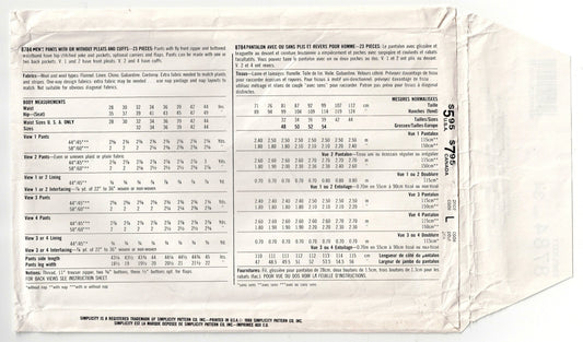 Simplicity 8784 Mens Pants & Shorts with Optional Pleats & Cuffs 1980s Vintage Sewing Pattern Waist 34 inches UNCUT Factory Folded