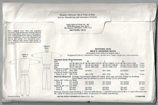 Kwik Sew 1915 Retro Mens Stretch Tracksuit 1980s Vintage Sewing Pattern Size S-XL UNCUT Factory Folded