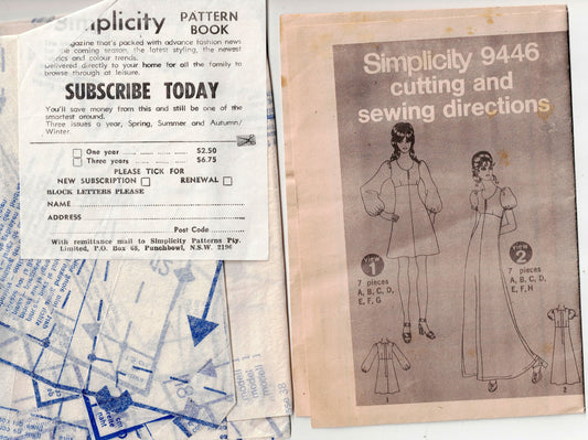 Simplicity 9446 Womens High Waisted Puff Sleeved Dresses 1970s Vintage Sewing Pattern Size 12 Bust 34 Inches