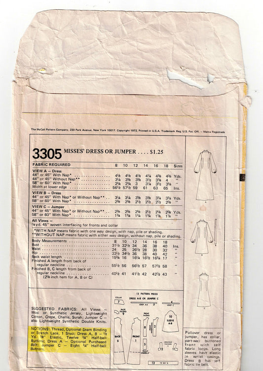McCall's 3305 Womens Wide Collar Dress or Pinafore 1970s Vintage Sewing Pattern Size 18 Bust 40 Inches