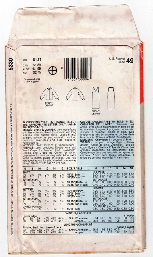 Butterick See & Sew 5330 Womens Loose Fitting Jumper Dress & Dolman Sleeved Shirt 1980s Vintage Sewing Pattern Size 12 - 16 UNCUT Factory Folded
