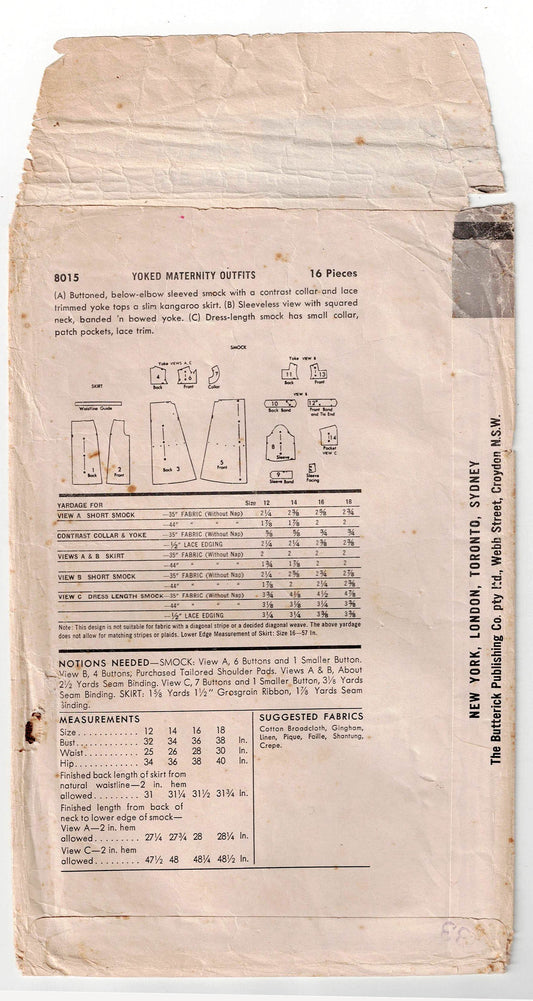 Butterick 8015 Womens Yoked Maternity Smock Top & Skirt 1950s Vintage Sewing Pattern Size 12 Bust 32 inches