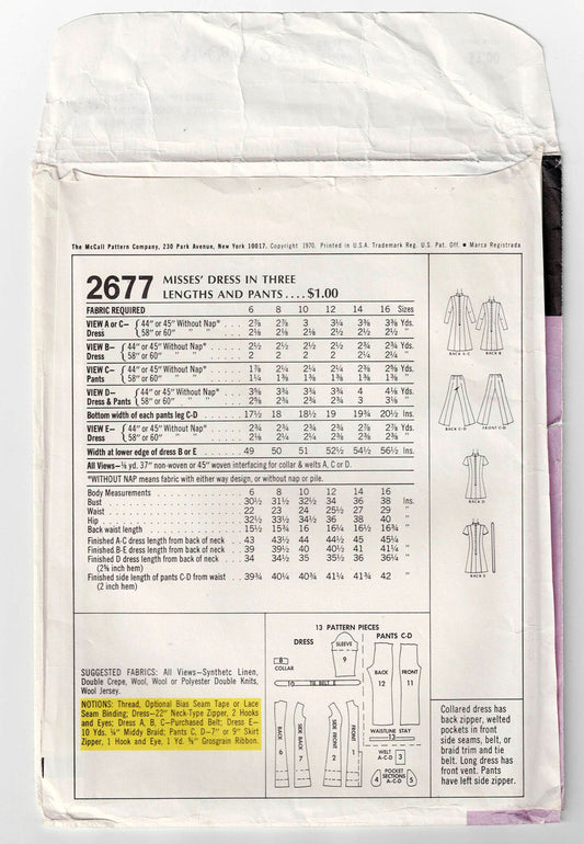 McCall's 2677 Womens Panelled Dress Tunic & Pants 1970s Vintage Sewing Pattern Size 12 Bust 34 inches