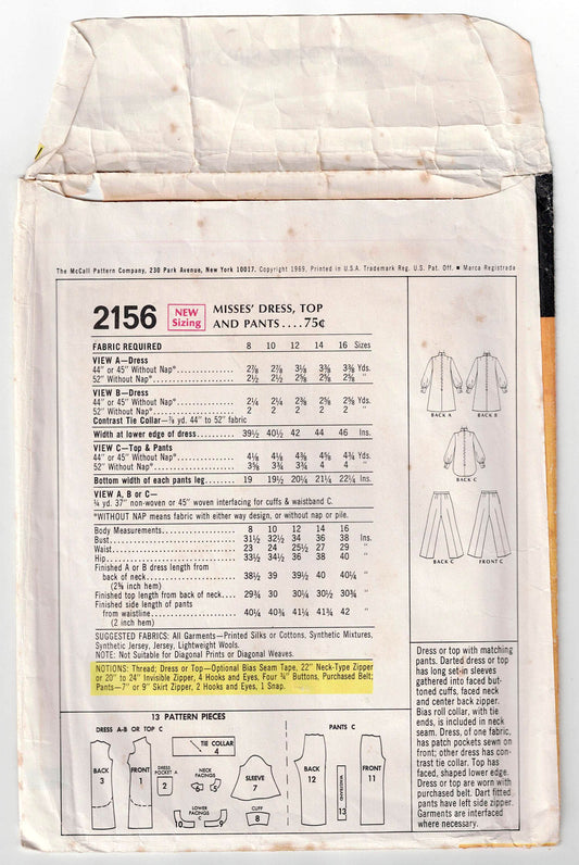 McCall's 2156 Womens Full Sleeved Dress or Top with Wide Cuffs Bias Tied Collar & Pants 1960s Vintage Sewing Pattern Size 14 Bust 36 inches
