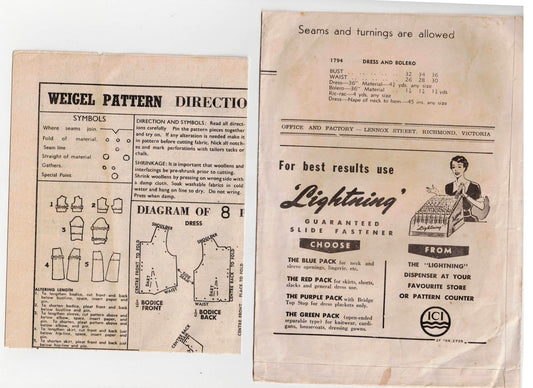 Weigel's 1794 Womens Full Skirt Dress & Back Buttoned Bolero Jacket 1950s Vintage Sewing Pattern Bust 32 inches