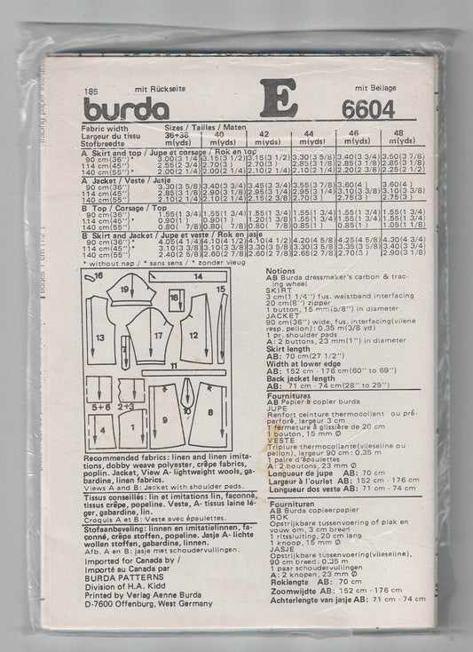 Burda 6604 Womens Summer Camisole Top Skirt & Jacket 1980s Vintage Sewing Pattern Sizes 10 - 22 UNCUT Factory Folded