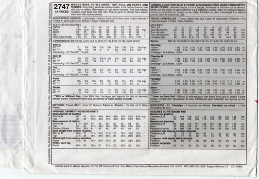 McCall's 2747 Womens Casual Tops Pants & Shorts Out Of Print Sewing Pattern Sizes 8 - 12 UNCUT Factory Folded