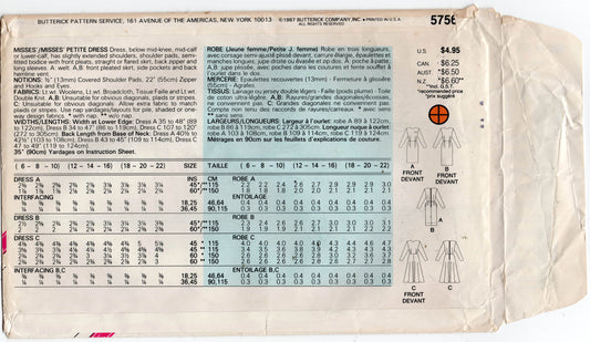 Butterick 5756 Womens EASY Dress with Slim or Full Skirt 1980s Vintage Sewing Pattern Size 12 - 16 UNCUT Factory Folded